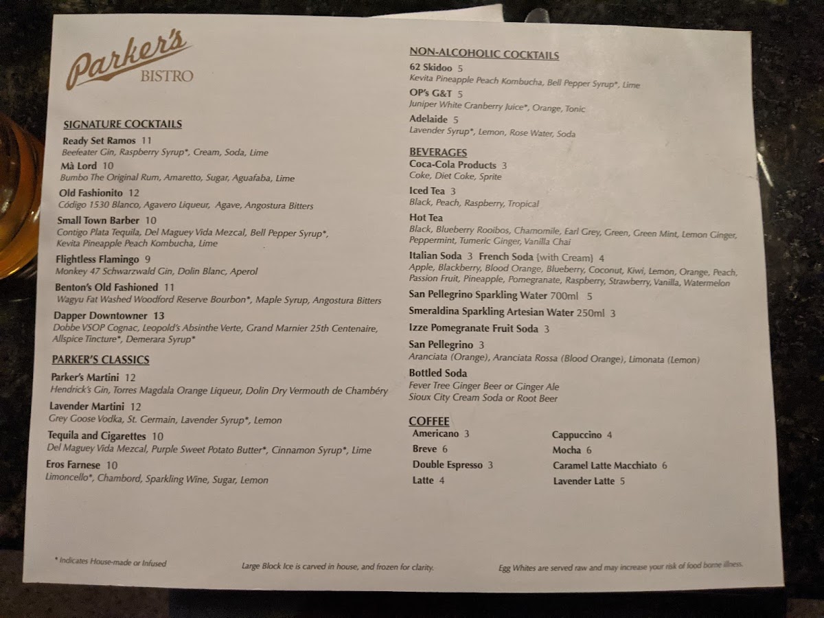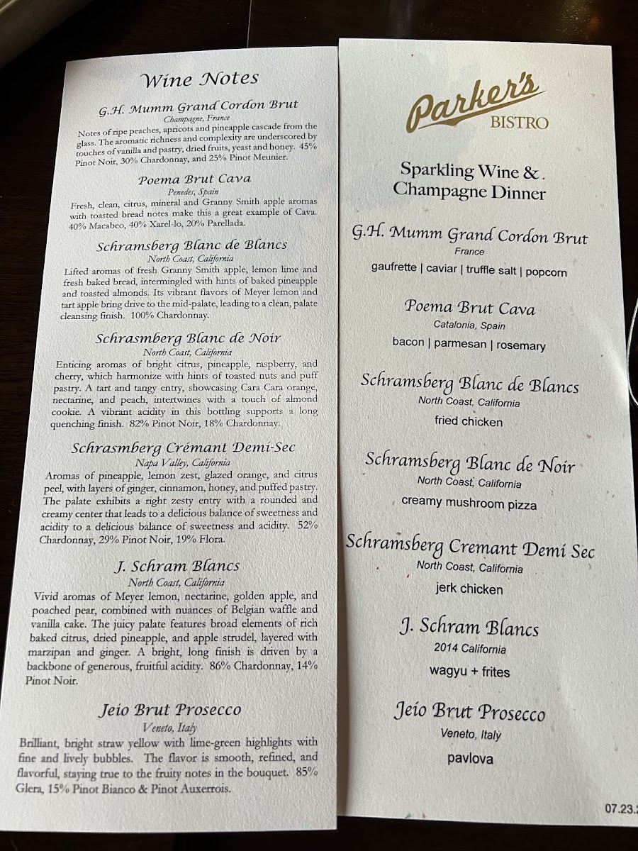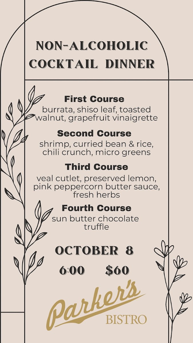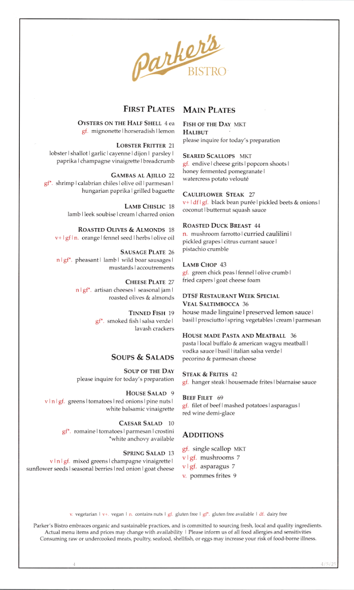 The Main Plates are where Parker's Bistro truly shines, with robust and flavorful dishes like Scallops (GF without crouton, N) that are perfectly seared and rich in flavor. The Cioppino (GF without baguette) is a seafood lover’s dream, a flavorful stew that showcases the best of the ocean's bounty. The Lamb Ragù (N) brings a tender, slow-cooked meat sauce that pairs beautifully with pasta. For meat lovers, the Zabuton Steak and Duroc Porchetta (GF, N) offer juicy, tender cuts that promise to satisfy your cravings.