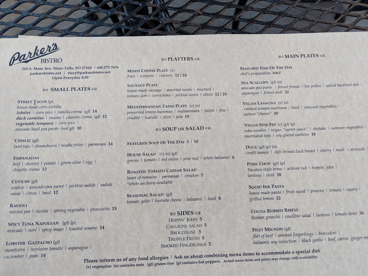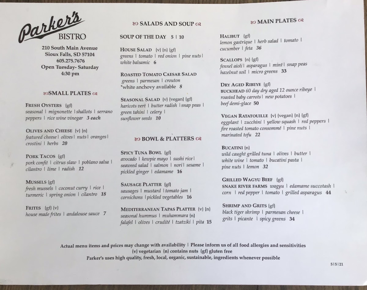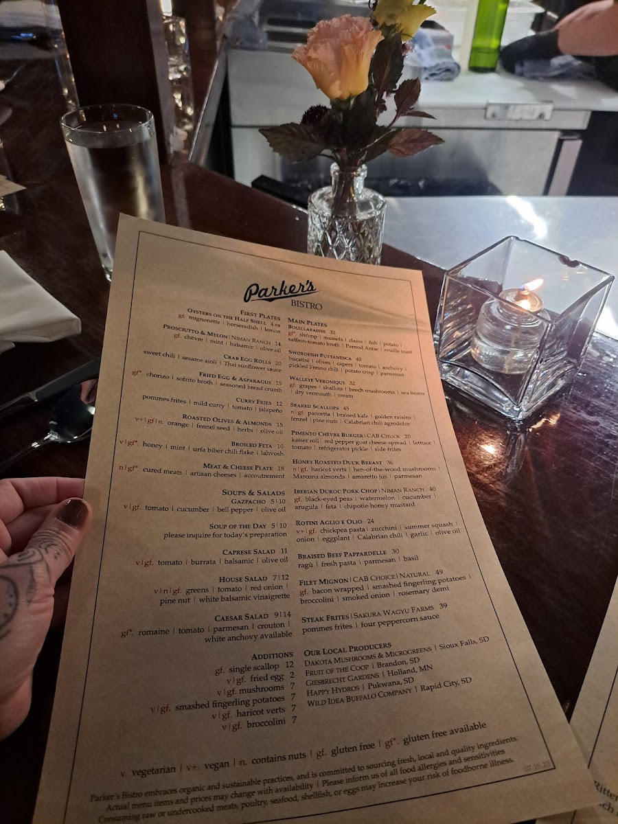 Parker's Bistro in Sioux Falls offers a delightful and varied menu that caters to a wide range of tastes. The First Plates section is an excellent way to start your meal, with options like Oysters on the Half Shell (GF) for a fresh, briny bite, or a Cheese Plate (N, GF) for a rich and savory selection of cheeses. For those who enjoy something more savory, the Crab Egg Rolls and Lettuce Wraps are perfect choices, while the Brie En Croûte (N) offers a luxurious and crispy pastry with a creamy cheese center.